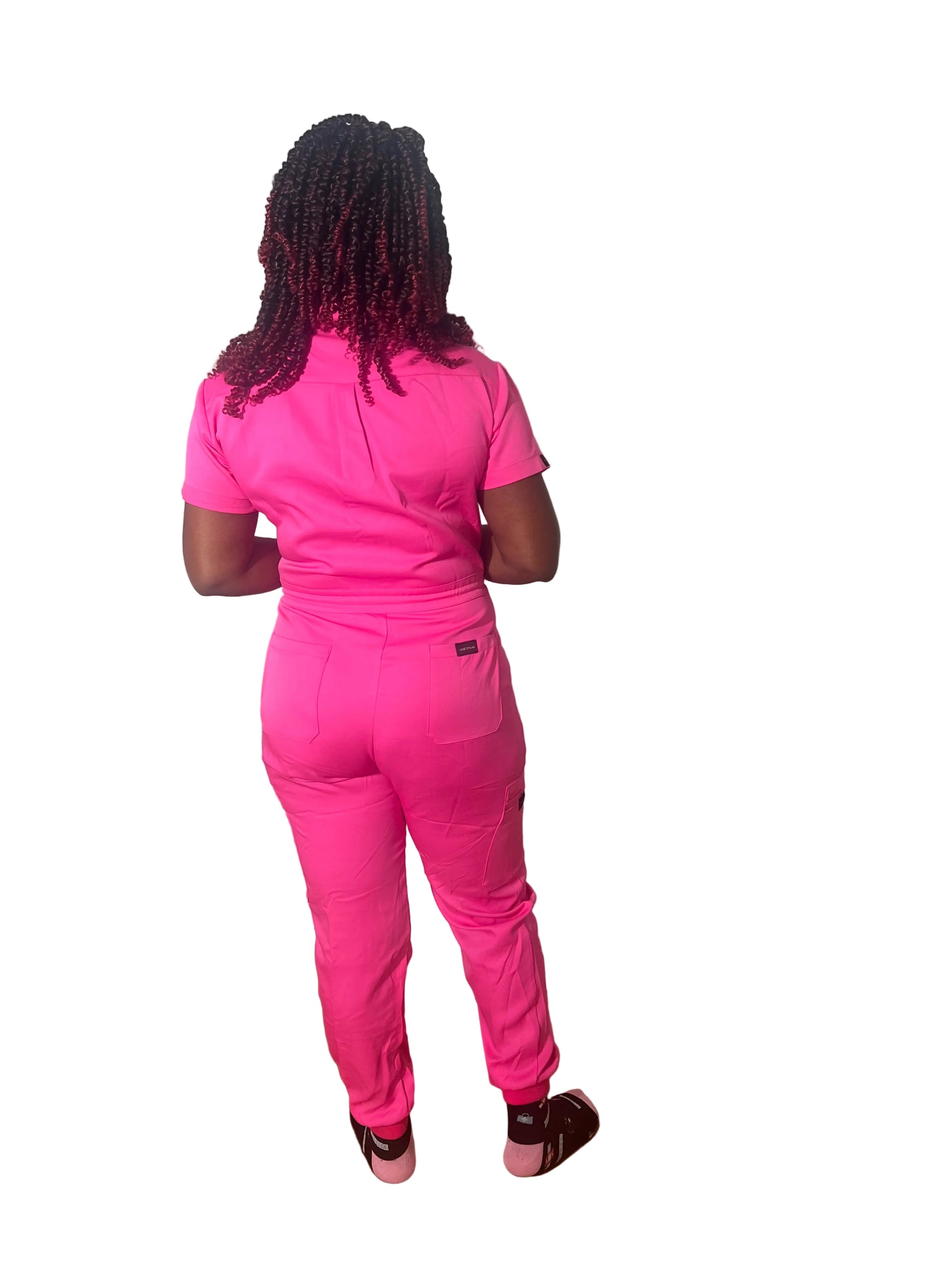 This Voge women’s pink scrub jumpsuit is a stylish and functional healthcare worker’s uniform. Here's what to expect: Deep bright pink color: A rich, vibrant pink that exudes professionalism